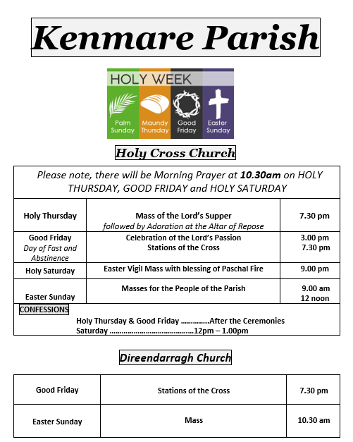 Welcome to the Kenmare Parish website. This website aims to cover all the questions you have in regards to Kenmare Parish. If you require further assistance, please do not hesitate to contact me. God bless. Fr. George Hayes, Parish Priest. (064 6641352)